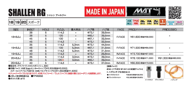 AMEの最新製品であるRGは、流行の流れが激しいドレスアップホイールでも、10年以上変わらぬ人気を誇る定番商品FX-55をベースに進化させたモデルであり、SHALLENの歴史を継承したシンプルかつスポーティーなデザインが魅力です。鋭い切れ味を持つナイフをモチーフにしたナイフド・スポーク形状を採用し、シャレンシリーズのどのモデルよりも強調した立体感(コンケイブ)が高級感溢れるオーラを演出します。SHALLEN RGは、長年愛され続けるデザインと、未来を見越した進化を両立させた逸品です。